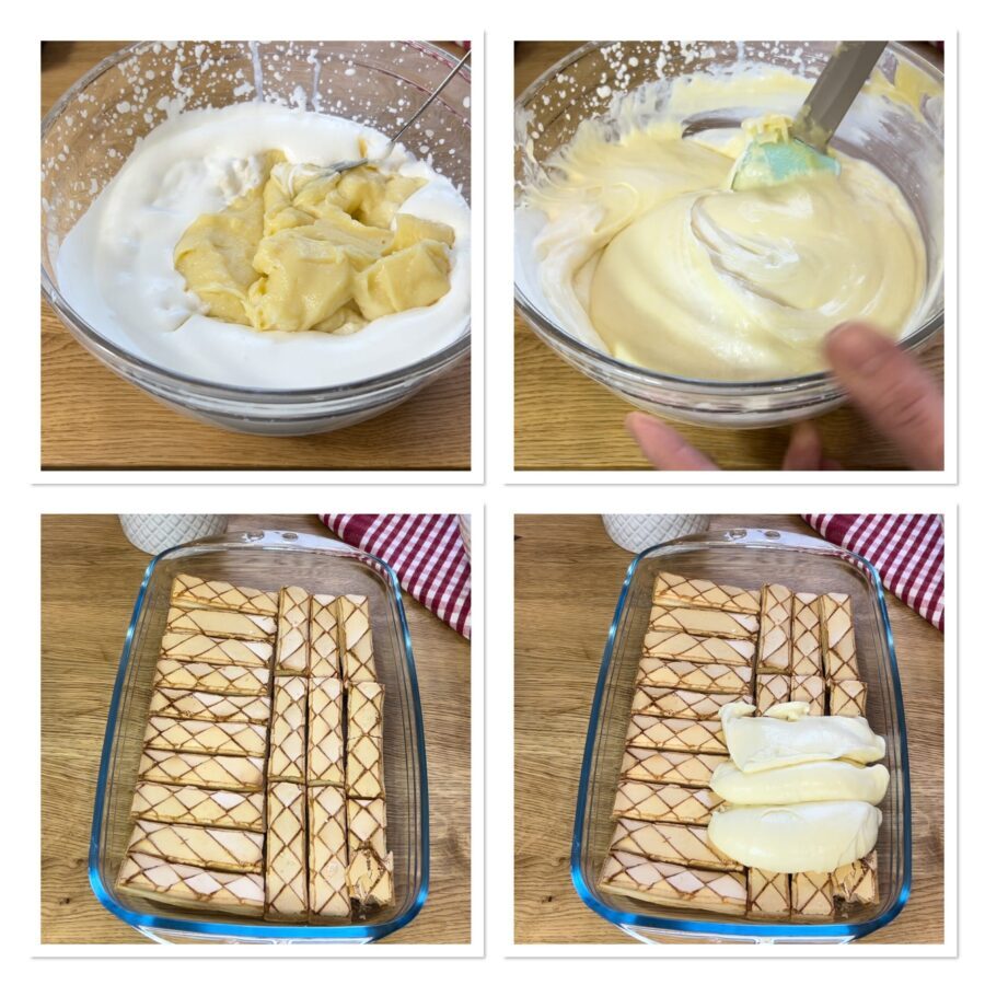La tarta está lista; te aconsejo dejarla reposar al menos 8 horas antes de servirla: los hojaldres absorberán algo de humedad de la crema, unificando el postre.