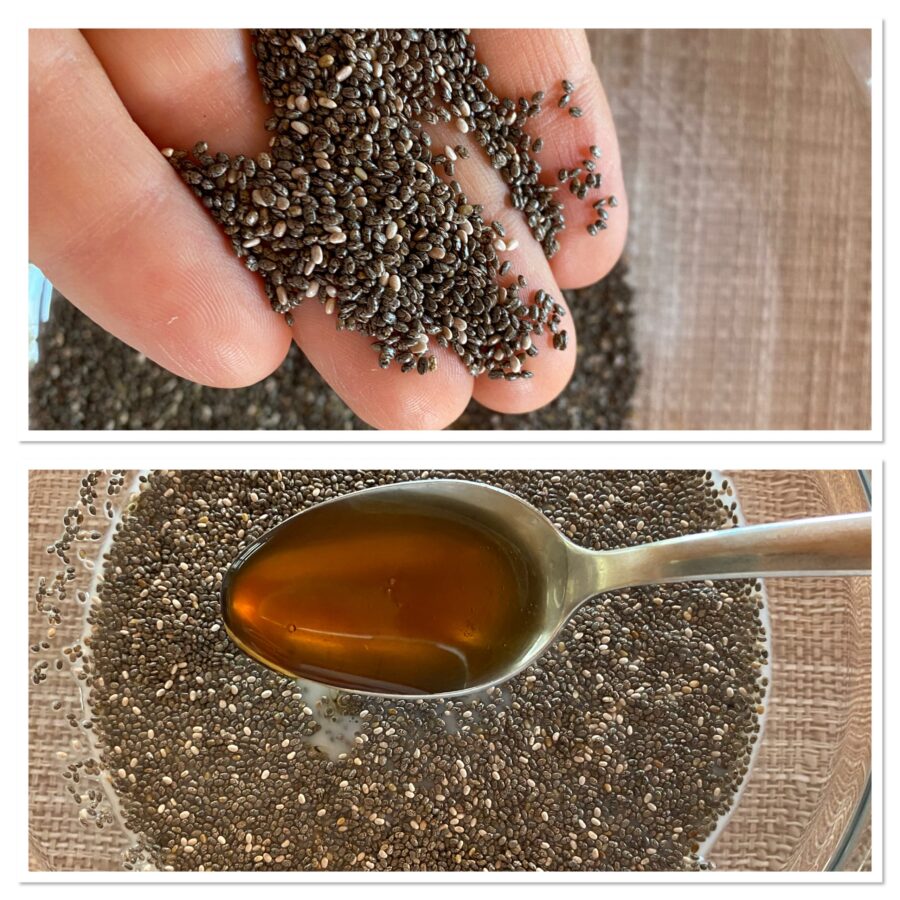 Para hacer el pudding de chía para un desayuno vegano con kiwi y melón o con la fruta fresca de temporada que prefieras, reúne en un cuenco las semillas de chía y mézclalas con la leche de arroz o con la leche vegetal que prefieras y con el sirope de arce.