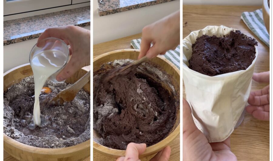 Tritura juntos todos los ingredientes secos: cacao, vainillina, azúcar, galletas, canela, clavos de olor y las almendras recién tostadas en la sartén. Vierte todo en un bol grande y añade la harina.