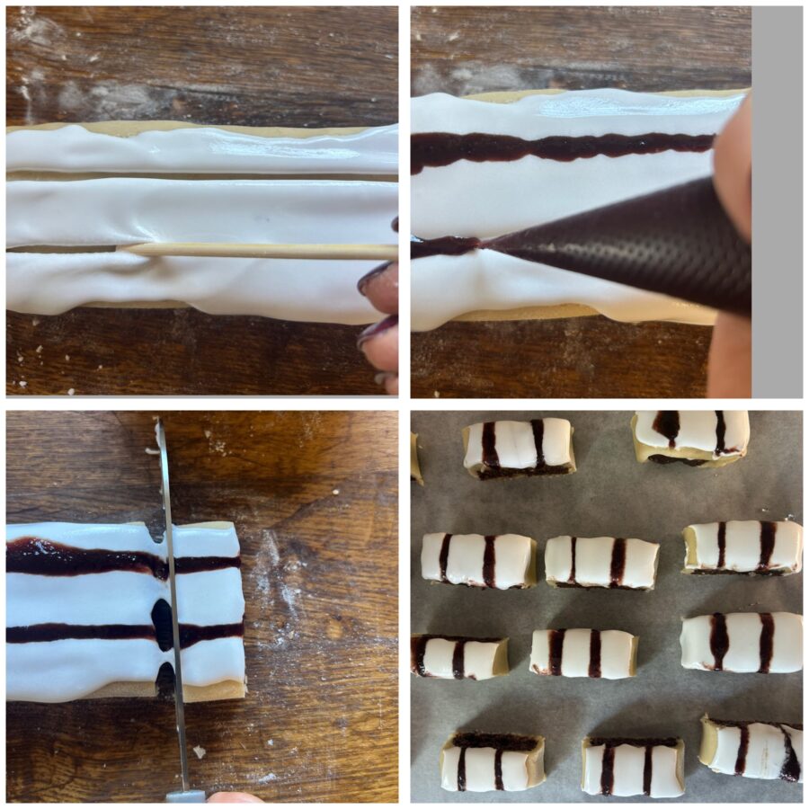 Con ayuda de un palillo o de utensilios improvisados, haz dos surcos paralelos en el glaseado y, con la manga pastelera, rellena los surcos con mermelada de amarena (si está demasiado compacta, caliéntala un poco). Ahora solo queda cortar las galletas con un ancho de unos 3,5 cm.
