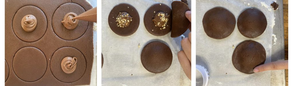 • Con ayuda de una manga pastelera, rellenad la mitad de los discos de masa con la crema para untar de avellanas y con un poco de avellanas picadas. Después, cubrid la galleta con los discos restantes y selladlos con los dedos.