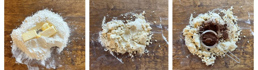 • Para hacer las galletas rellenas de Nutella, empezad por la masa quebrada de cacao: desmenuzad la mantequilla con la harina y, a continuación, añadid también el cacao tamizado.