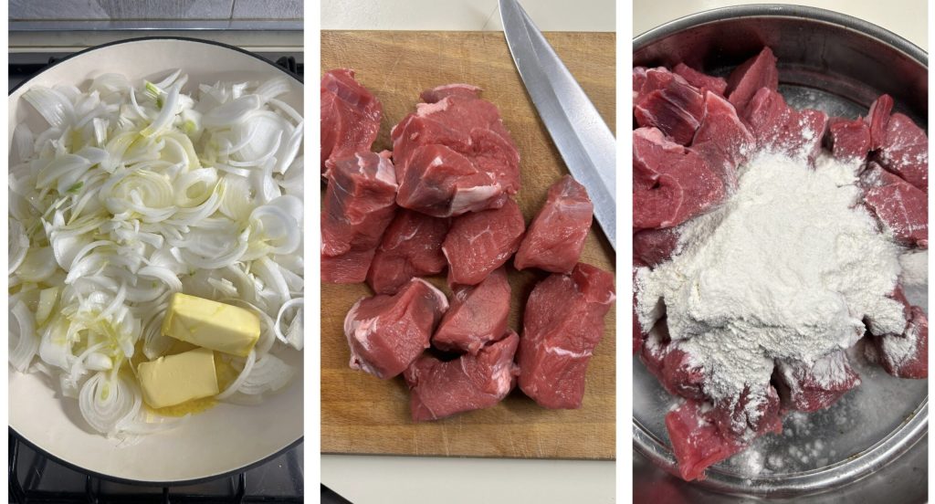 Para preparar el goulash trentino, comienza pelando y cortando las cebollas en láminas. Reúnelas en una olla amplia de fondo grueso, añade la mantequilla, la sal y el aceite y deja que se pochen a fuego bajo. Corta la carne en trozos de unos 50 g, colócala en un recipiente, añade la harina y mezcla para que cada trozo quede bien cubierto.