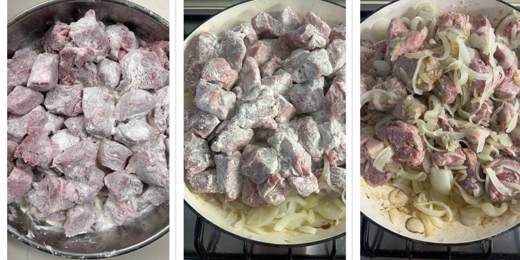 Cuando la cebolla esté pochada, añade los trozos de carne enharinados, eliminando antes el exceso de harina. Deja que se doren y se impregnen de sabor.