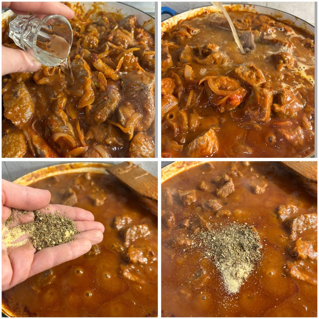el vinagre y deglasa a fuego vivo. Cuando haya evaporado la parte alcohólica del vino, añade tanto caldo como sea necesario para cubrir la carne, mezcla y tapa la olla. Cocina durante aproximadamente 2 horas y media a fuego muy bajo en la cocina mediana o pequeña, añadiendo más caldo si hace falta. Media hora antes de que la carne esté lista, incorpora el ajo, el resto de las especias y mezcla bien.
