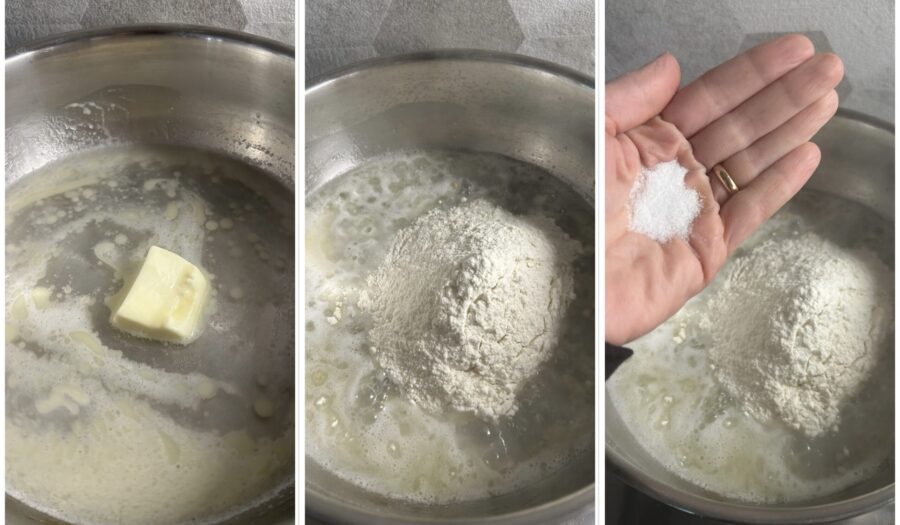 Unid el agua y la mantequilla en un cazo, llevad a punto de ebullición y añadid la harina de una sola vez y la sal. Cocinad y mezclad hasta que se forme una masa lisa y homogénea que tenderá a despegarse del cazo (si no usáis una olla antiadherente, se formará una ligera película, es normal).