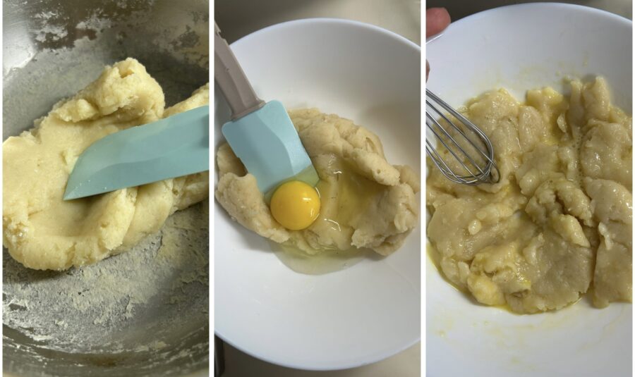 Mi masa necesitó tres huevos, pero según la harina podríais tener que añadir algunos gramos extra de huevo. Al final de todas las incorporaciones debéis obtener una crema bien consistente y no líquida.
