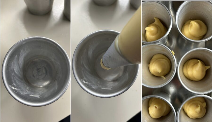 Engrasad los moldes para babá y rellenadlos hasta poco menos de 1/3.