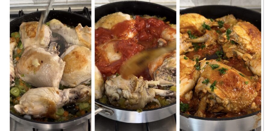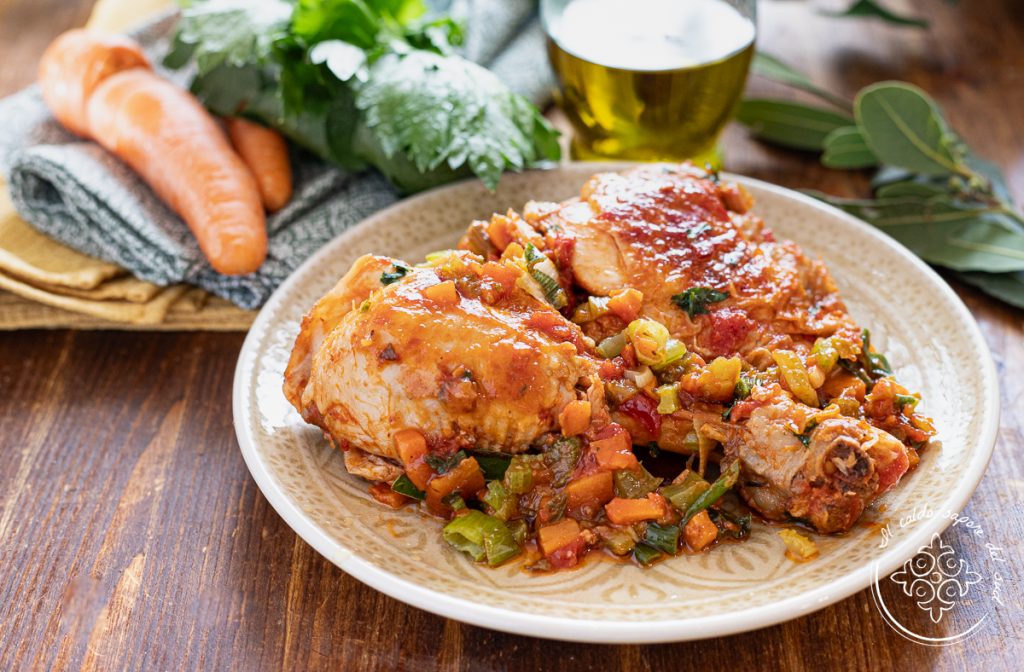 Receta de la abuela del pollo a la cazadora, ingredientes y preparación para un segundo plato tradicional y sabroso. Vamos a preparar juntos el pollo a la cazadora toscano, la receta de la abuela de un segundo que huele a hogar y familia, igual que el pollo asado entero al horno con patatas. El Pollo a la Cazadora o Pollo a la Florentina es una receta típica de la Toscana que hunde sus raíces en la tradición culinaria campesina de la región. Aunque muchos reivindican su invención, parece que el pollo a la cazadora nació precisamente en la Toscana, a finales del siglo XIX y principios del XX, periodo en el que el pollo se convirtió en el protagonista principal de la alimentación campesina. Con el tiempo la receta traspasó los límites de su región de origen, convirtiéndose en una de las recetas clásicas de la cocina italiana, casi al mismo nivel que la Pizza Margherita. Para quien no conozca esta deliciosa receta, hablamos de trozos de pollo, dorados en sartén con los aromas y olores clásicos de la cocina tradicional de la abuela: cebolla, apio y zanahoria y luego vino blanco, romero y laurel. Un segundo plato tan fácil y económico como sabroso que incluso puede convertirse en plato de fiesta y sobre todo de Navidad. Mojar el pan en la deliciosa salsa es un gesto imprescindible para un plato que, como este, aporta a la familia alegría, sabor, color y serenidad. Pero no os preocupéis: si el pollo a la cazadora, aunque buenísimo, no es la receta que buscáis y queréis otras ideas sobre Cómo cocinar el pollo, probad la pechuga de pollo a la mediterránea con cebollas y tomates secos, o el pollo a la cerveza en cazuela, o también el pollo al horno con patatas y cebollas y el pollo a la cazadora en blanco. Vamos a la cocina, pero antes de ponernos a cocinar os recuerdo que si queréis estar al día de todas mis recetas, podéis seguir mi página de Facebook (aquí) y mi perfil de Instagram (aquí).