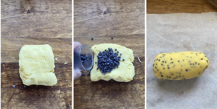 Trabajad hasta obtener una masa homogénea, pero no la calentéis demasiado. Dejad reposar la masa en la nevera unos diez minutos, luego añadid rápidamente las gotas. Tened cuidado de no calentar la masa para evitar que el chocolate y la mantequilla se derritan.