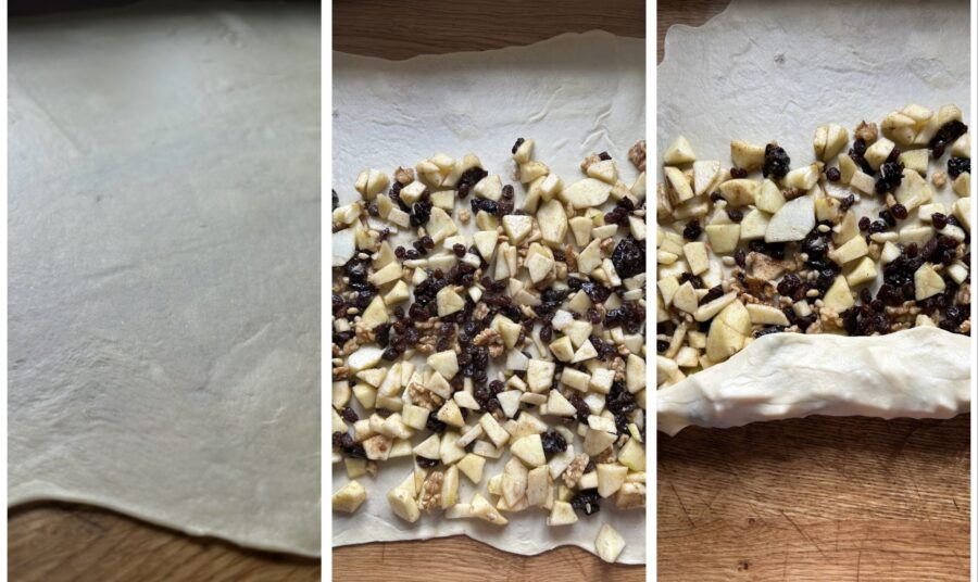 • Con la lámina extendida y muy fina (un rectángulo de aproximadamente 40 x 55 cm), repartid el relleno dejando libres un par de centímetros a los lados y algo más en la parte superior del rectángulo (en el lado largo).