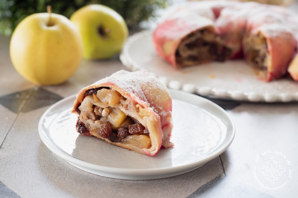 Rocciata umbra, la receta de la abuela. Yo siempre la he llamado rocciata assisana, porque fue en Asís donde la probé por primera vez, junto con la torta al testo, pero la rocciata es una especialidad de toda Umbría y de Las Marcas, y es un dulce que se parece por completo al strudel de manzana en el que se inspira. Una especialidad regional, que forma parte de todos esos postres con manzana italianos y no italianos que tanto me gustan y que preparo con frecuencia. La rocciata umbra debe su nombre al verbo «arrocciare», es decir torcer o enroscar, y parece que fueron los lombardos, al llegar a la Italia central, quienes crearon este dulce uniendo los ingredientes básicos del strudel tradicional con productos ya presentes en el territorio, como las nueces. La receta de la abuela de la rocciata assisana, o mejor dicho de la rocciata umbra, tiene como peculiaridad el color rosado de la superficie, que se obtiene vertiendo sobre el dulce recién salido del horno, cuando aún está muy caliente, un poco de alchermes. La rocciata umbra está compuesta, como el strudel, por una masa tipo pasta matta que envuelve un relleno preparado con manzana en trozos, nueces, azúcar, piñones, canela en polvo, pasas, cacao y ralladura de limón. Originalmente la rocciata umbra se consideraba un postre otoñal, dado que las nueces maduran en esa época, ingrediente fundamental. Por tanto su preparación estaba asociada a la fiesta de Todos los Santos y a todos esos dulces vinculados a la conmemoración de los difuntos, que se consumían hasta Navidad. Hoy en día, la preparación de la rocciata se ha «adaptado» también a otras épocas del año, como Carnaval y Ferragosto, para satisfacer la nostalgia de quienes, por trabajo o por necesidad, no podían disfrutarla en su periodo «natural» y solo durante las vacaciones. La preparación de la rocciata assisana o rocciata umbra es sencilla: después de estirar la masa en una lámina fina, se reparte el relleno, se enrolla todo formando un cilindro y se «arroccia» formando la característica caracola. Se coloca en una bandeja y se hornea, para terminar con el alchermes. Para hacer la rocciata umbra, por último, no se necesitan ni mantequilla ni huevos, por lo que hablamos también de un postre vegano y apto para vegetarianos. Vamos a la cocina ahora, preparemos nuestra rocciata umbra con la receta de la abuela, pero antes de arremangarnos os recuerdo que, si queréis estar al día con las nuevas recetas, podéis seguir mi página de Facebook (aquí) y mi perfil de Instagram (aquí).