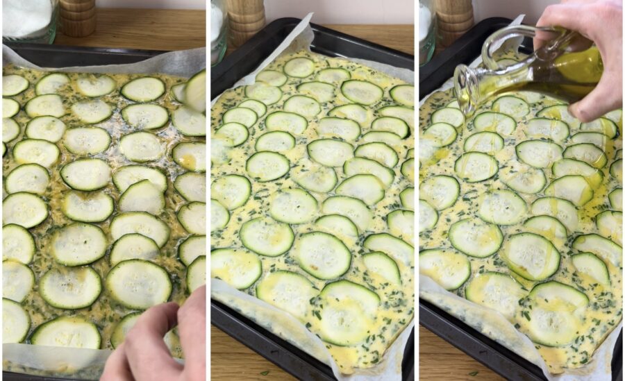 Lamina los calabacines con un pelador o una mandolina, deben quedar muy finos. Vierte la mezcla en una bandeja rectangular (aprox. 35×40) cubierta con papel de horno y distribuye sobre ella las láminas de calabacín de forma ordenada.
