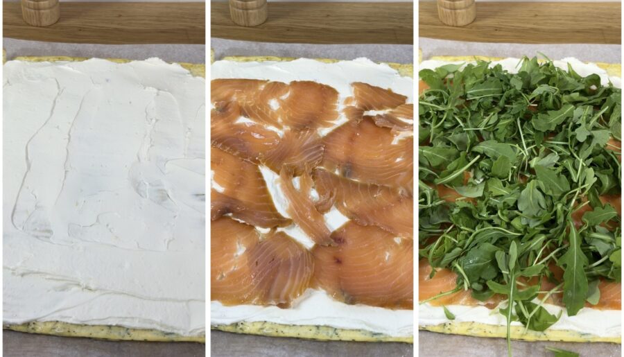 Reparte el queso por la tortilla, coloca también el salmón y la rúcula.
