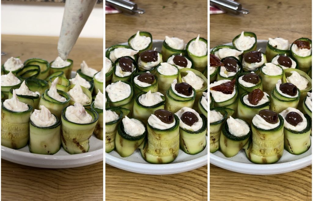 • y rellena los rollitos de calabacín a la plancha. Adorna con aceitunas y tomates secos y sirve en la mesa, o bien conserva en la nevera hasta dos días.