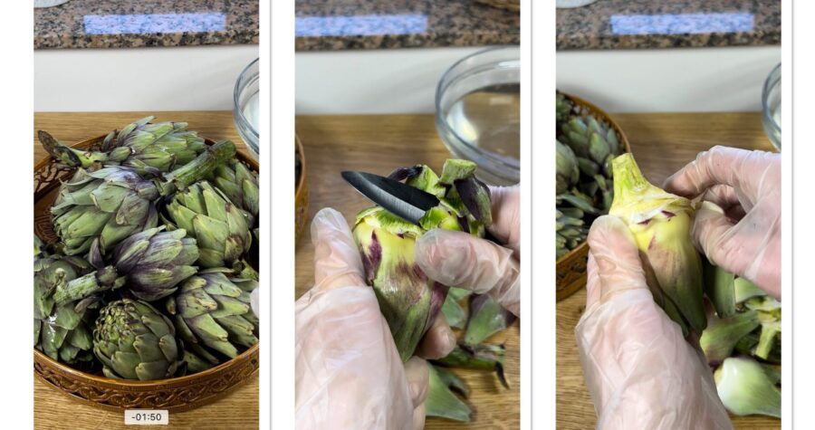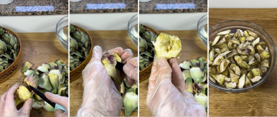 • Enjuagad las alcachofas bajo el agua corriente, quitadles las hojas externas, cortad también el tallo y peladlo a fondo. Cortad luego la parte superior del tallo y obtened solo el corazón.