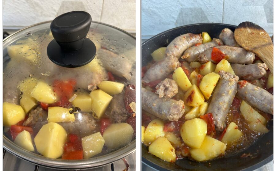 Preparación de las salchichas en sartén con patatas y pimientos