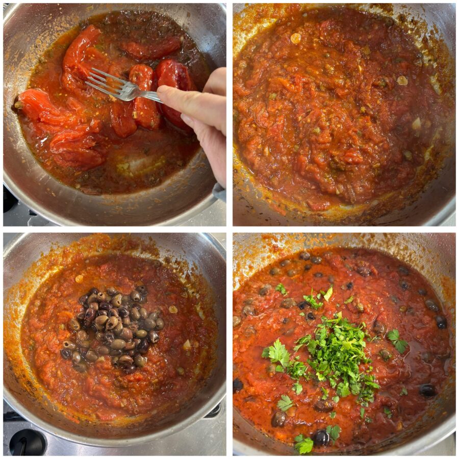 las alcaparras se desalaban y se pican con cuchillo, el ajo perfuma el aceite sin llegar a quemarse, las anchoas se disuelven poco a poco, dejando solo sabor. Los tomates pelados se aplastan con el tenedor para que la salsa quede rústica y auténtica. La cocción es lenta, hasta que el color se oscurece y el aroma llena la cocina.