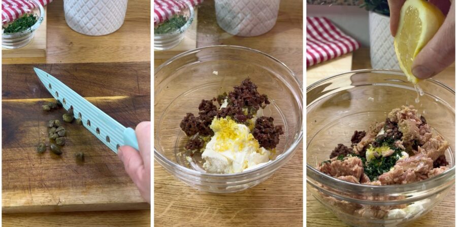 con las alcaparras. Reúne todos los ingredientes picados en un bol junto con la robiola, la ralladura de limón y un poco de zumo y mezcla.