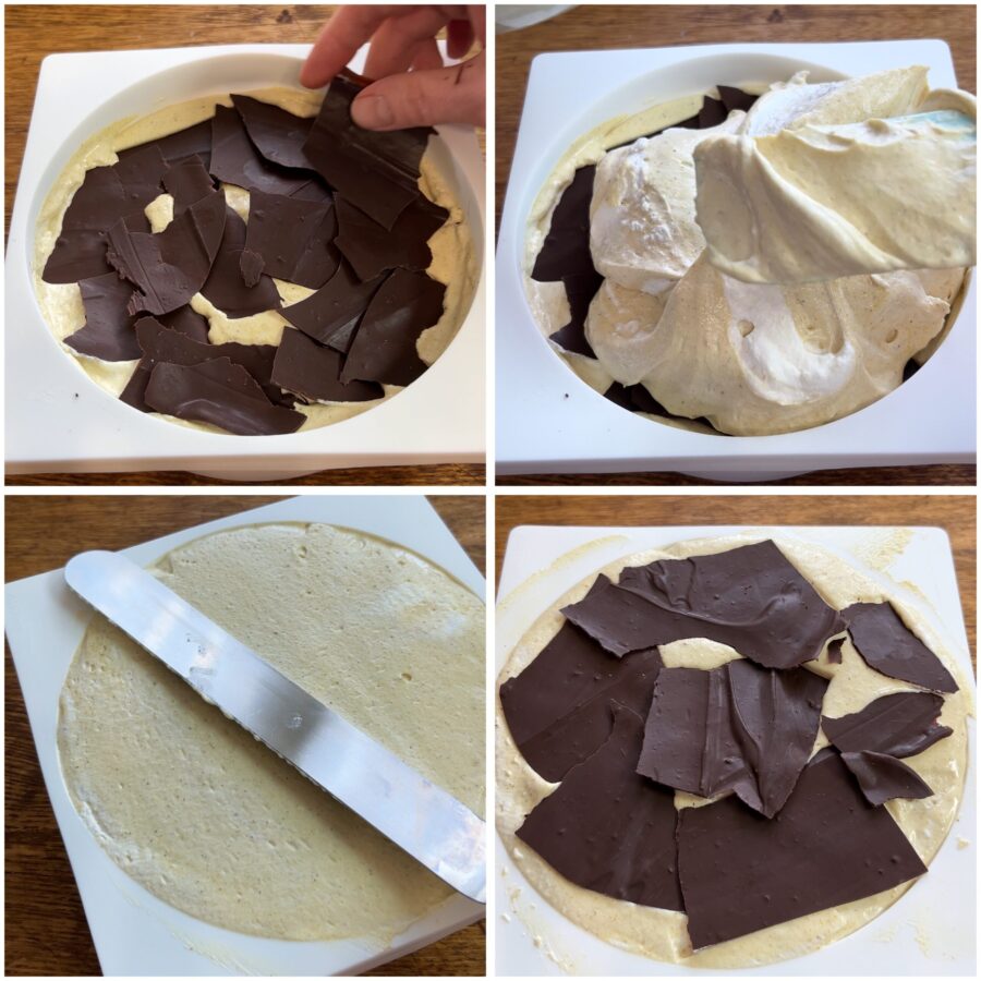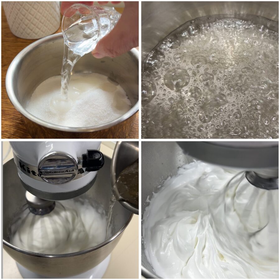 • Preparamos el merengue italiano. Ponéis el azúcar en un cazo y añadís el agua, removéis y lleváis a ebullición cuidando de que todo el azúcar se disuelva. Tener un termómetro de cocina sería ideal; deberéis alcanzar los 121°C. Mientras el almíbar se cocina, empezad a montar las claras a punto de nieve, luego verted el almíbar en hilo, sin dejar de batir la mezcla. El calor del almíbar cocinará las claras y el merengue cogerá consistencia; trabajad hasta que se haya enfriado.