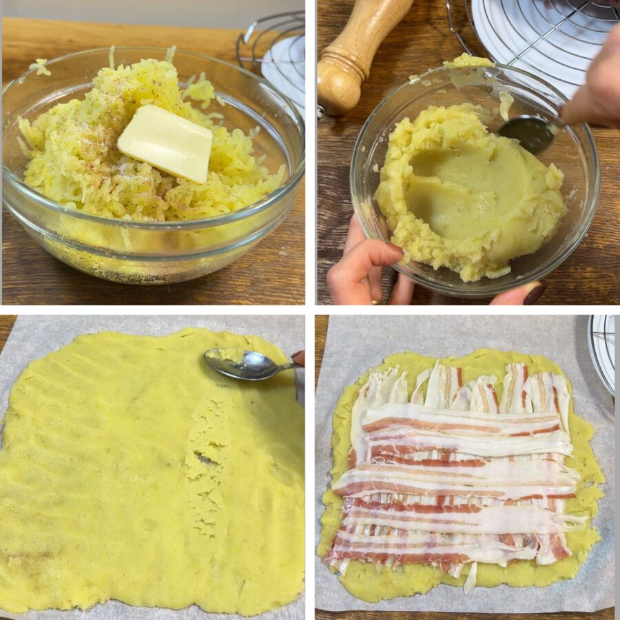 Incluso antes de empezar a cocinar el solomillo. Una vez cocidas las patatas —que también podéis hervir unos 35 minutos o hasta que estén blandas (haciendo la prueba del palillo para comprobar que se pinchan con facilidad)—, chafadlas y aliñadlas con una pizca de sal, mantequilla, pimienta y nuez moscada, mezclad bien. Desenrollad una hoja de papel de horno, extended la capa de patata nivelándola bien y colocad encima las lonchas de guanciale o panceta formando una rejilla.