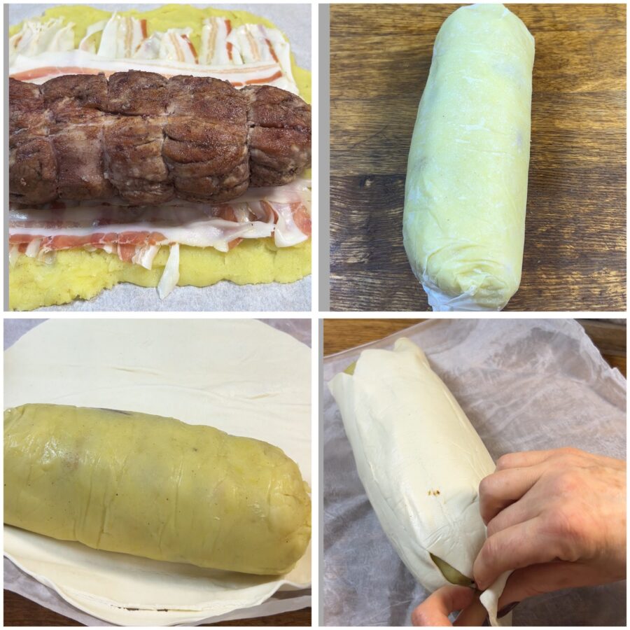 Colocad el solomillo, al que habréis quitado el hilo, y con la ayuda del papel de horno enrollad formando un cilindro compacto. Luego desenrollad la masa de hojaldre y envolved el cilindro de patata y carne con ella.