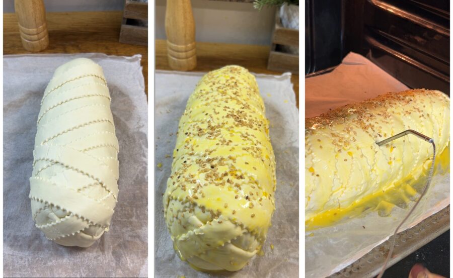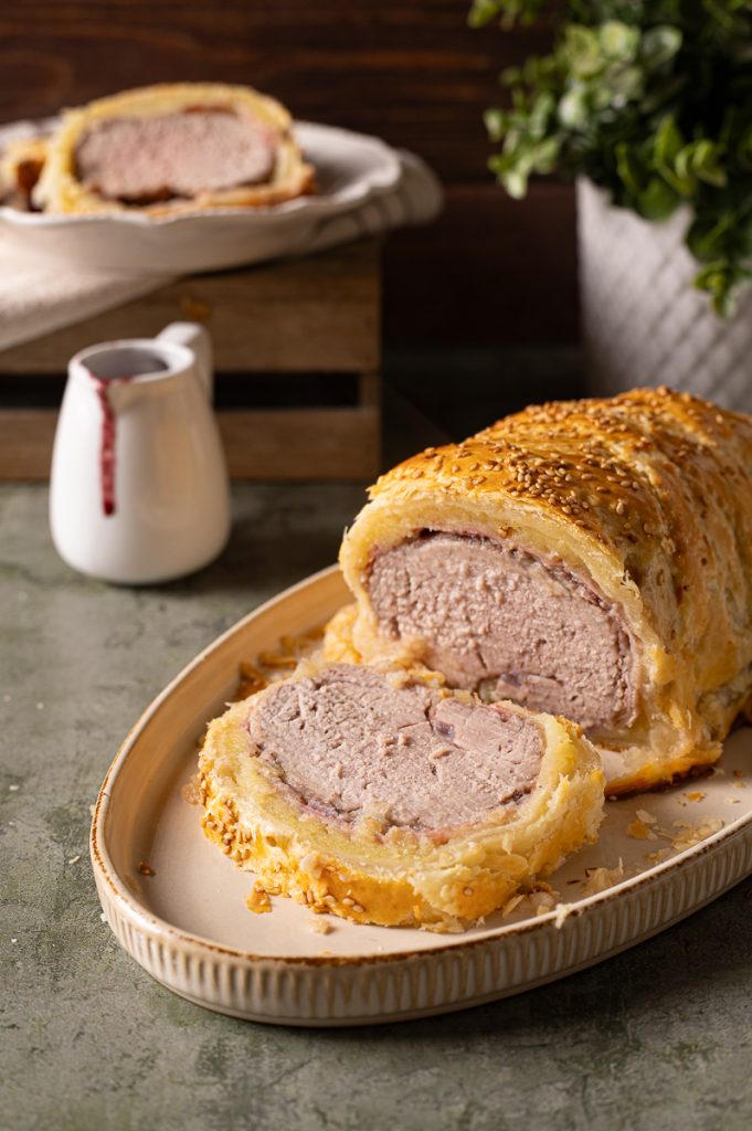 Recoged el otro rollo de hojaldre, cortad tiras y utilizadlas para formar un trenzado alrededor de vuestro solomillo en costra. Este trenzado no tendrá solo una función estética, sino que también ayudará a sostener toda la preparación. Pincelad con la yema batida mezclada con un poco de leche, espolvoread con semillas de sésamo, pinchad con una sonda adecuada y hornead en horno caliente a 170°C durante 45 minutos, o hasta alcanzar la temperatura en el centro del solomillo de 65°C para una cocción jugosa; tened cuidado de no superar los 70°C. Evitad pinchar el solomillo durante la cocción, perdería sus jugos y se secaría.