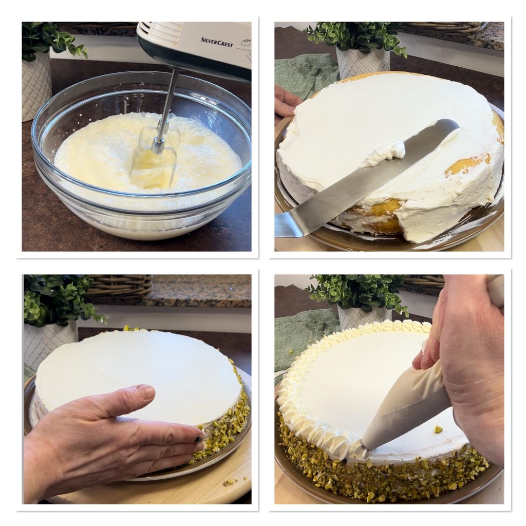 Después de cubrir toda la superficie de la tarta con la nata, decoradla por los bordes con el granillo de pistacho y rematad con copos de nata.