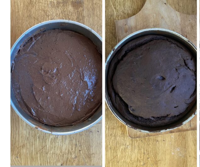• Mezclad todo y verted en un molde forrado con papel de horno. Hornead en horno precalentado a 170°C durante 45 minutos en modo estático, o alternativamente a 145°C en freidora de aire durante 50 minutos.