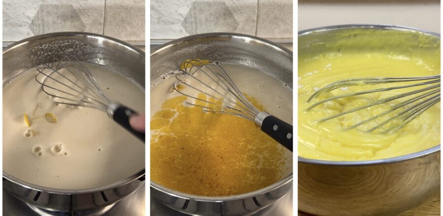 Añade un trocito de ralladura de limón, la cúrcuma para dar color y deja espesar a fuego moderado, removiendo continuamente.