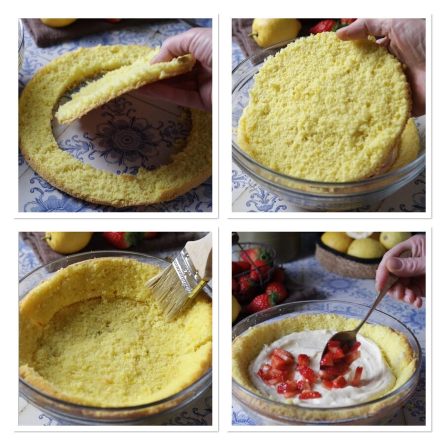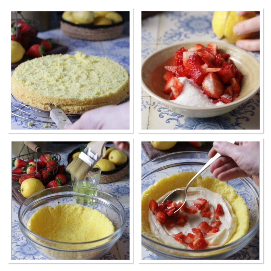 Toma un bol con fondo cóncavo de 20 cm de diámetro y coloca el primer disco de bizcocho con la parte esponjosa hacia arriba y la corteza hacia abajo, báñalo con el almíbar hecho mezclando el licor Strega con el agua y adáptalo al fondo del recipiente. Rellena con 1/3 de la crema y la mitad de las fresas.