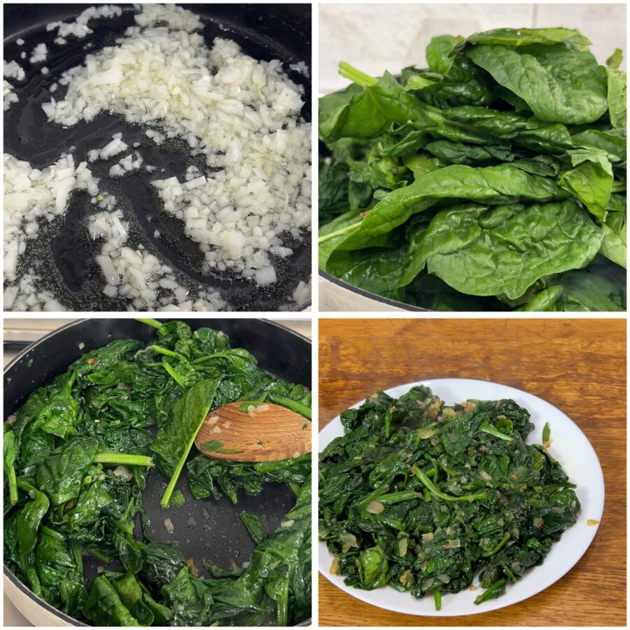 Para hacer la tarta rústica de espinacas, pica finamente la cebolla y sofríela con un buen chorro de aceite; añade las espinacas, limpias, lavadas varias veces y escurridas muy bien.