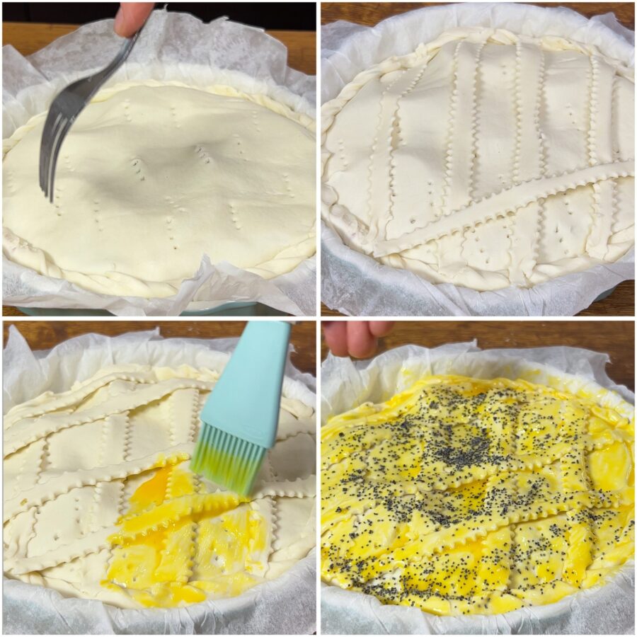 Elimina la masa que sobresale (pasando un rodillo por encima), sella los bordes de la tarta salada y pincha la superficie con los dientes de un tenedor.