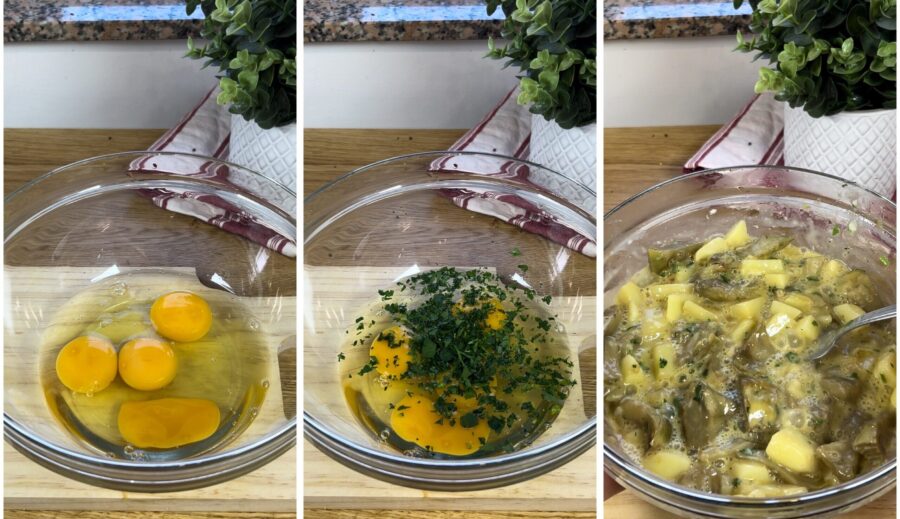 • Romped los huevos en un bol, añadid el perejil y el queso, incorporad las alcachofas y las patatas y mezclad.