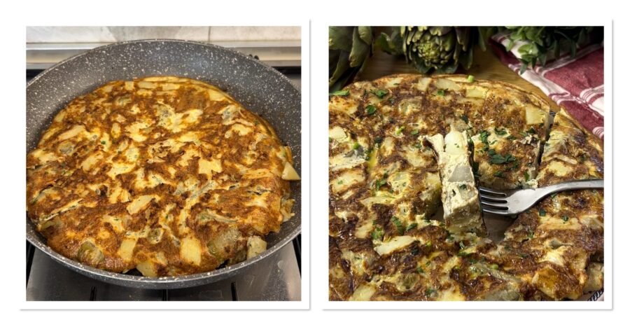 Nuestra tortilla de alcachofas y patatas está lista; está buena tanto caliente como tras unas horas de reposo a temperatura ambiente. Se conserva en la nevera, cerrada en un recipiente hermético, durante 2 días.