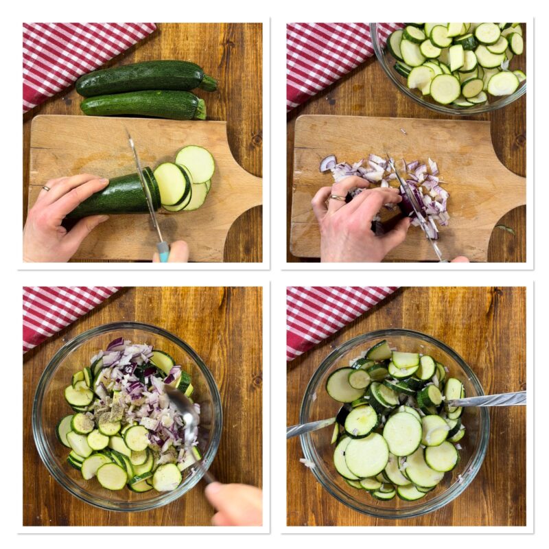 Lava los calabacines y quítales los extremos, córtalos en rodajas no demasiado finas y colócalas en un bol. Pela, enjuaga y pica una cebolla, añádela al bol con los calabacines, incorpora un chorrito de aceite, una pizca de sal y especias al gusto (me encanta añadir la mezcla de especias para asados con sal), y mezcla.