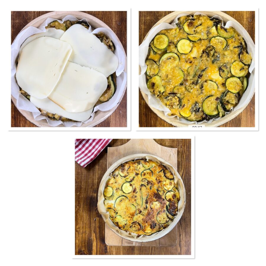 Los calabacines se cuecen primero en el horno, así quedan ligeros y sabrosos, sin necesidad de freír. Luego se mezclan con los huevos y el queso, mientras que en el interior se forma un corazón tierno y fundente que hace cada porción irresistible.