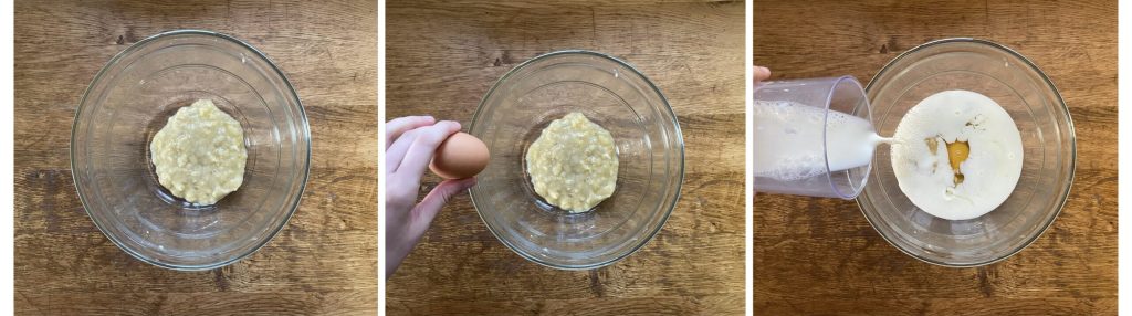 Para hacer las tortitas de plátano, empezad por cortar en rodajas un plátano maduro y colocad las rodajas en un bol. Aplastadlas con un tenedor hasta obtener una mezcla homogénea y