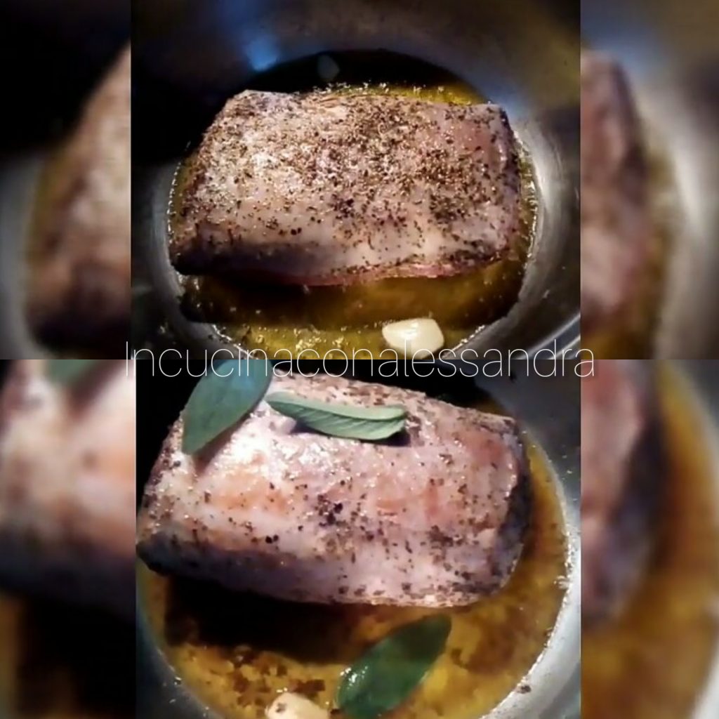 En una olla calienta el aceite, sofríe los dientes de ajo. Masajea todo el lomo con sal y orégano. Pon la carne en la olla, séllala bien por todos los lados, añade las hojas de salvia. Cuando esté bien dorada, agrega el vino blanco y deja evaporar… continúa luego la cocción a fuego bajo, cubriendo con una tapa, de vez en cuando gira la carne