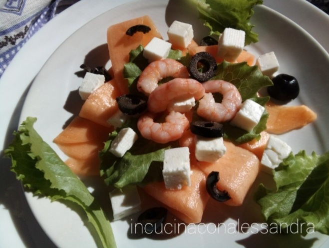 Ensalada de melón, gambas y feta