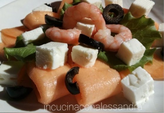 Cortar el melón por la mitad y eliminar las semillas. Usando el pelador, sacar tiras o cortarlo en trozos. Cortar las aceitunas en rodajas y el feta en trozos. Tomar un cazo y llevar a ebullición un poco de agua con sal, y cuando esté hirviendo, echar las gambas y escurrir después de un minuto. Tomar un plato llano y emplatar colocando primero las rodajas de melón un poco enrolladas, añadir en el centro algunas hojas de lechuga y encima colocar algunas gambas. Ahora añadir el feta y las aceitunas. Adornar el plato con algunas hojas de lechuga. Condimentar todo con un hilo de aceite y sal y servir inmediatamente.