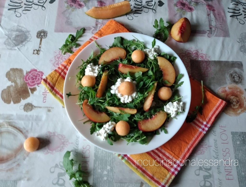 Primero, lava bien los melocotones y córtalos en rodajas. Toma medio melón y con un sacabolas especial haz bolitas de melón. Lava la rúcula y sécala un poco con papel absorbente. En un plato grande, comienza a montar la ensalada, primero coloca la rúcula sobre el plato, añade las rodajas de melocotón y las bolitas de melón sobre la rúcula. Decide tú cómo colocarlas, si en fila o dispersas, como más te guste. Toma el requesón y con una cuchara pon un poco entre la fruta. En un cuenco pequeño, mezcla el aceite, el vinagre balsámico, la sal y la pimienta y emulsiona bien. Aliña la ensalada removiendo un poco, la ensalada está lista para servir.