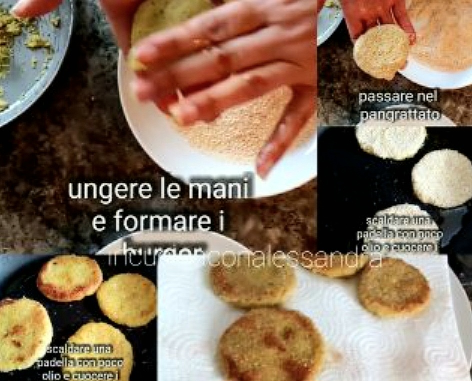 Antes que nada, limpiar y lavar bien los calabacines. Cortar en rodajas, coger un cazo, llenarlo de agua y añadir los calabacines; cuando empiece a hervir, cocer durante 6/7 minutos. Escurrir bien y triturar con una batidora de mano. En una sartén, sofreír en un poco de aceite la cebolla picada. Ajustar de sal los calabacines, añadir la cebolla sofrita y luego ir incorporando poco a poco, siempre removiendo, la harina de garbanzo hasta obtener una consistencia bastante firme; haced la prueba de si podéis formar la hamburguesa. En ese punto, añadir una pizca de cúrcuma y una cucharada de pan rallado, mezclando bien.