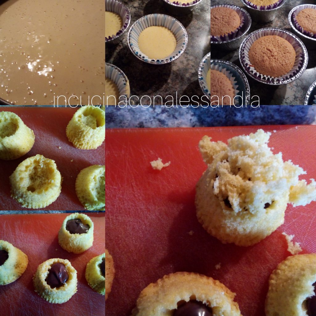 En un bol batir los huevos y el azúcar, añadir la harina tamizada, la levadura y la cáscara de limón, mezclar bien. Verter la mezcla en los moldes o moldes para muffin engrasados y enharinados, hornear a 180° durante unos 15/20 minutos. Asegúrate de comprobar la cocción con un palillo, porque puede variar de un horno a otro. Una vez cocidos, dejar enfriar. Tomar los muffins y darles la vuelta, cortar la parte central haciendo un agujero y llenarlo con la crema de avellanas. La parte del muffin que queda, cortarla en trocitos. Extender un poco de crema alrededor de todo el muffin, tomar los trocitos cortados y esparcirlos alrededor del muffin, emplatar y servir. Puedes acompañarlos también con nata o fruta cortada en trocitos.