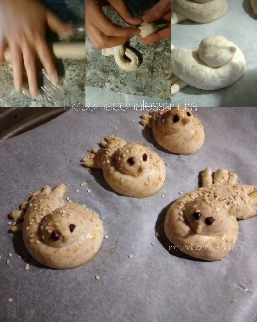 Una vez que la masa está lista y ha levado, corta un trozo de masa y haz un cilindro redondo, corta pequeños trozos y forma bolitas que formarán la cabeza, por supuesto el tamaño lo decides tú según cómo más te guste, yo hice el tamaño de un panecillo normal. Haz otro cilindro redondo, corta un trozo de unos 10/12 centímetros, colócalo sobre papel de horno, toma los dos extremos y crúzalos dejándolos por fuera, con un cuchillo haz 2 incisiones en cada extremo, formaremos la cola, toma las bolitas preparadas y colócalas encima del agujero que se forma al cruzar la masa, con los dedos intenta formar un pequeño pico, toma las aceitunas y córtalas en trocitos muy pequeños, unta con un poco de leche o aceite la superficie de las palomas, cúbrelas con semillas de sésamo, toma 2 trocitos de aceituna y haz los ojos presionando un poco para que no se caigan. Deja levar media hora y hornea en el horno precalentado a 180° y cocina por 10/15 minutos. Sirve las palomas en un platito para cada invitado.