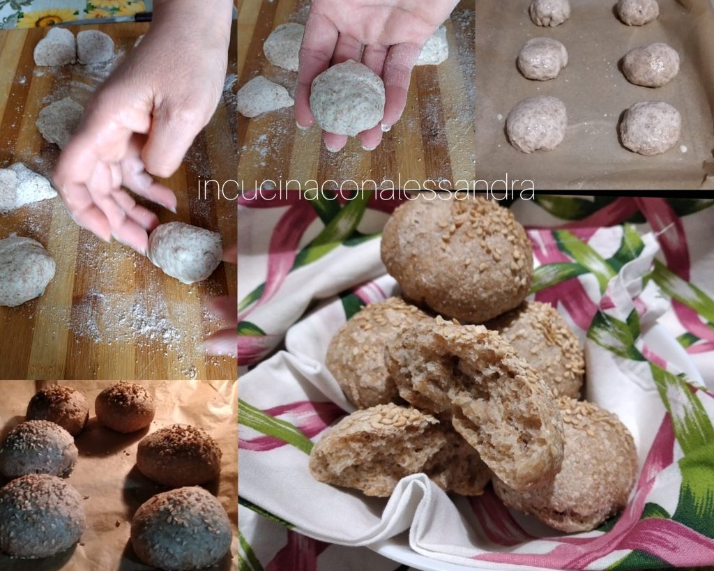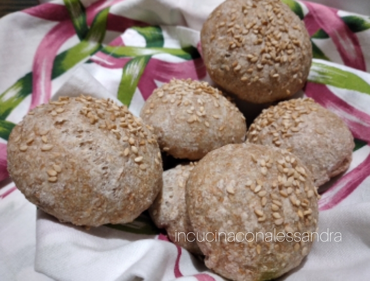 En un bol grande, verter la harina, la levadura y el azúcar, mezclar con las manos para incorporar aire en la harina. En una cacerola calentar el agua, debe estar ligeramente tibia, luego verterla poco a poco en la harina mientras se mezcla. Añadir una cucharada de aceite de oliva virgen extra, siempre mezclando, y finalmente la sal. Pasar a una mesa de trabajo y continuar amasando con las manos, estirar la masa y luego doblarla, continuar amasando hasta que esté suave, lisa y homogénea. En este punto, volver a poner en el bol y dejar fermentar al menos una hora cubierto con un paño de cocina. Pasado el tiempo, volver a coger la masa, estirarla, hacer pliegues formando una bola. Formar nuevamente una bola homogénea y dejar fermentar hasta que doble su tamaño siempre cubierto. Cuando haya fermentado, formar las bolitas de los panecillos, decidir el tamaño, yo los hice de 50g. Tomar una bandeja rectangular forrada con papel de horno y colocar las bolitas de masa preparadas un poco separadas ya que seguirán creciendo. Dejar fermentar otros 30/40 minutos, pincelar con un poco de aceite o agua y espolvorear la superficie con semillas de sésamo. Hornear en el horno caliente a 180° durante unos 15 minutos o al menos hasta el dorado deseado. Cuando estén listos, dejar enfriar sobre una rejilla.
