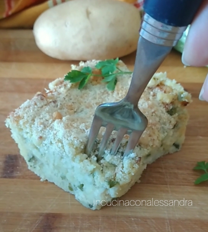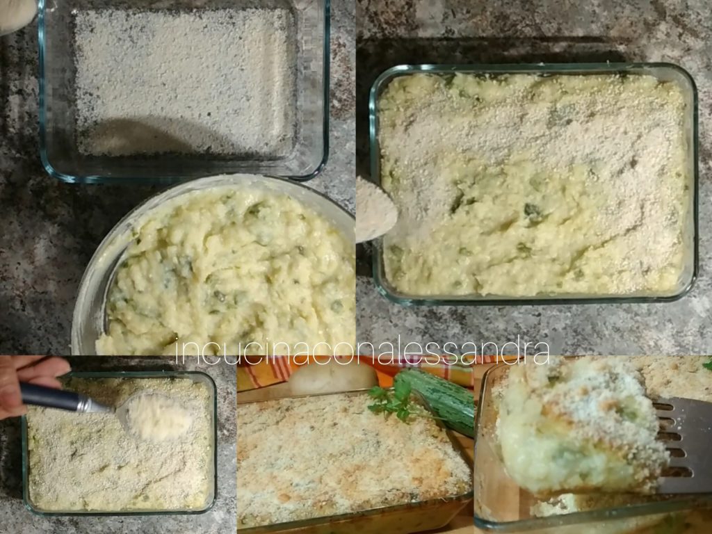 Primero, lavar bien las patatas con la piel y los calabacines, en un cazo con agua poner a cocer las patatas con la piel, deben estar cocidas pero firmes. Mientras se cocinan, cortar los calabacines en trozos pequeños y picar la cebolla, en una sartén poner un poco de aceite y sofreír la cebolla, después añadir también los calabacines, un poco de agua y la sal, cubrir con una tapa y cocinar durante 10 minutos. Cuando las patatas estén listas, escurrirlas del agua, dejar enfriar 5 minutos y luego quitar la piel y ponerlas en un bol, añadir los calabacines cocidos y aplastar bien con un prensador de patatas, ajustar la sal, rallar un poco de nuez moscada y añadir el pan rallado y la bechamel, (la bechamel me había sobrado de cuando preparé las lasañas, si queréis prepararla encontraréis mi receta en el blog, si no, también vale la comprada), mezclar todo bien, tomar una fuente para horno, poner en el fondo un poco de pan rallado, verter la mezcla preparada y nivelar, hacer una capa de pan rallado, una capa de queso parmesano rallado y luego otra capa de pan rallado, hornear en el horno caliente y cocinar durante al menos 20 minutos o hasta que esté dorado a gusto.