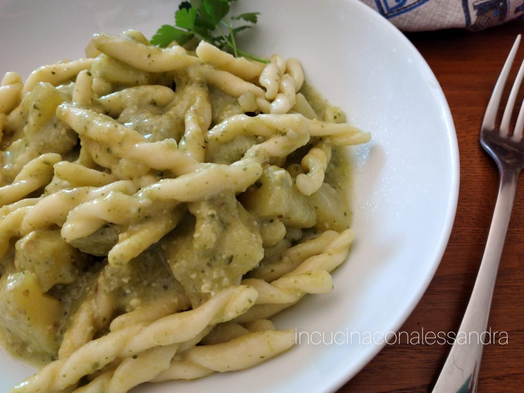 Los strozzapreti con pesto de rúcula y patatas son un primer plato fácil y muy apetitoso y súper cremoso que se puede considerar como un plato único, pocos ingredientes para un resultado exquisito y todo vegetal. El pesto de rúcula es un pesto facilísimo de realizar, excelente para la pasta caliente, pero exquisito también para la pasta fría de verano.