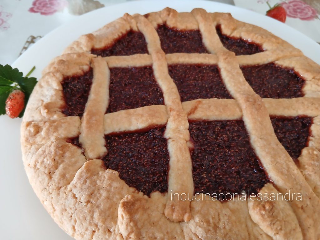 En un bol poner la harina, el azúcar, una cucharadita de levadura en polvo para dulces, la ralladura de un limón, la pizca de sal, luego los huevos y la mantequilla a temperatura ambiente cortada en trozos, comenzar a amasar con las manos, cuando comience a integrarse transferir a una tabla de amasar y amasar hasta que se convierta en una masa suave y homogénea. Envolver la masa quebrada en film alimentario y poner en la nevera durante unos 30 minutos. Mientras tanto preparar el relleno, después de haber lavado bien todas las fresas silvestres, ponerlas en una cacerola, añadir el azúcar, poner al fuego a llama baja y mezclar cuando el azúcar comience a derretirse continuar la cocción durante unos diez minutos o al menos hasta que se espese pero no debe volverse tan densa como una mermelada. Pasados los 30 minutos extender la masa quebrada con un rodillo y hacer un espesor de aproximadamente 1 cm, dejar aparte un poco de masa quebrada que servirá para las decoraciones. En un molde enmantequillado y enharinado poner la masa quebrada, haciendo al menos de 2 cm. en los lados, pinchar la masa quebrada con un tenedor. Verter encima el relleno preparado. Extender la masa quebrada restante y cortarla en tiras, doblar hacia el interior los bordes de masa quebrada y poner encima las tiras cortadas. Hornear en horno caliente a 180° durante unos 30/35 minutos o al menos hasta el dorado deseado.