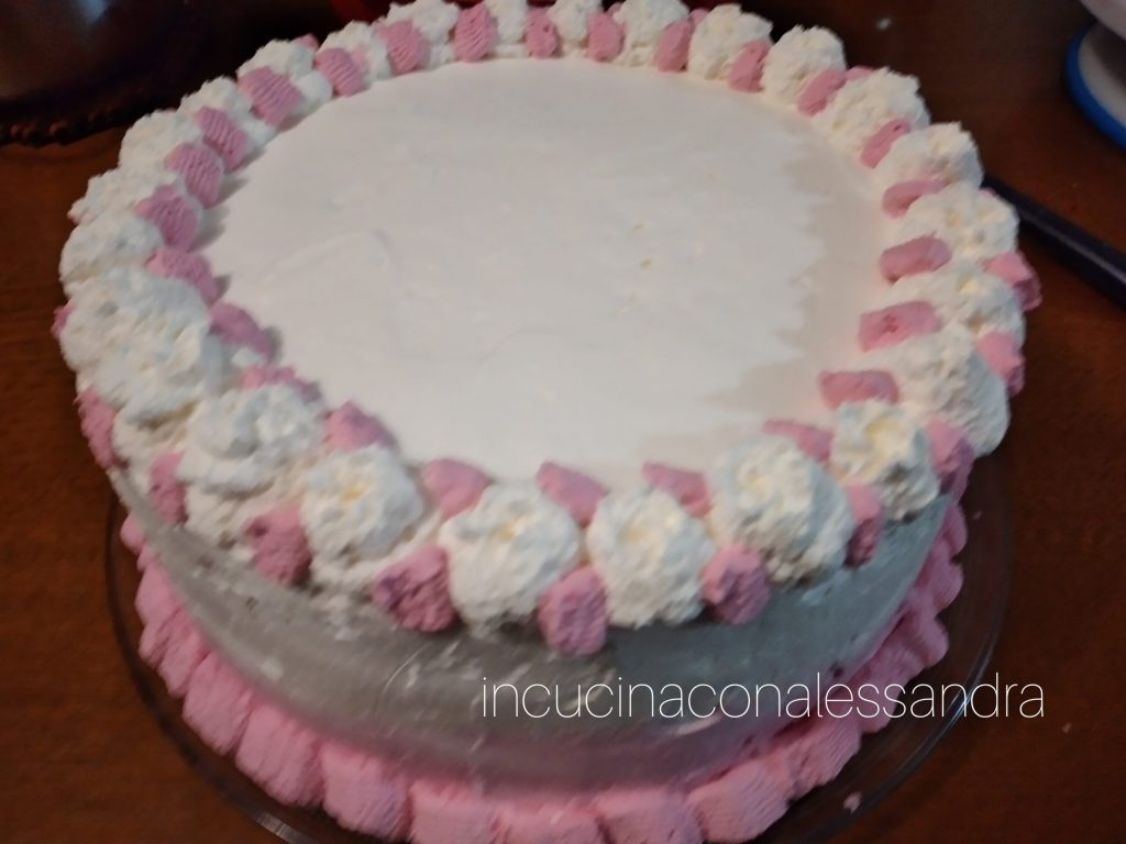 • Sacar el bizcocho del molde y con un cuchillo especial cortarlo en 4 partes. Poner el primer disco en una base giratoria o en un plato de servir y mojar con la leche, cubrir con la mitad de la crema pastelera y nivelar bien, tomar el segundo disco y mojar con la leche, rellenar con la crema de chocolate y extender bien, repetir también con el tercer disco y rellenar con la crema pastelera, mojar también el último disco con la leche y cubrir. Montar la nata vegetal, cuando esté lista dividirla en 2, en una parte poner unas gotas de colorante rojo para alimentos, decidir vosotros la tonalidad que queréis obtener y mezclar de abajo hacia arriba sin desmontarla. A este punto empezamos a cubrir la tarta, yo he empezado con la nata rosa en el fondo de la tarta unos 5/6 centímetros, luego arriba cubrir con la nata blanca, en el punto donde se encuentran las 2 natas intentar mientras se extiende difuminar un poco, intentar alisar lo más posible la nata. Tomar 2 mangas pasteleras y llenarlas una con la nata blanca y la otra con la nata rosa, usar las boquillas que prefiráis, en la base de la tarta hacer unos rosetones rosas. Arriba con una boquilla más grande hacer rosetones de nata blanca, entre un rosetón de nata blanca y otro hacer otros pequeños con la nata rosa. Una vez terminado con la nata llenar la parte central de arriba de grageas de azúcar de colores, poner los grageas de colores también de lado, deben literalmente lanzarlas sobre la nata. Su tarta está lista, si no la cortan inmediatamente ponerla en el frigorífico.